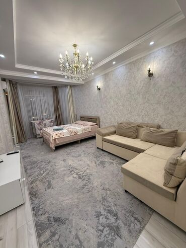 - Просторная единая зона кухни‑гостиной с выходом на окно в пол и плотными шторами.