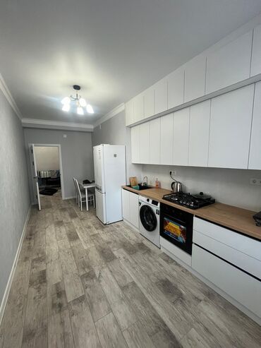 Уютная квартира с современным ремонтом. Спальня обставлена двуспальной кроватью с мягким изголовьем и прикроватными тумбочками. Стильная люстра обеспечивает приятное освещение. Кухня оборудована светлой мебелью с деревянными элементами, встроенной техникой, включая холодильник и микроволновую печь. Обеденная зона дополнена круглым столом и удобным стулом. В ванной комнате установлена ванна с душевой лейкой и современный унитаз.
