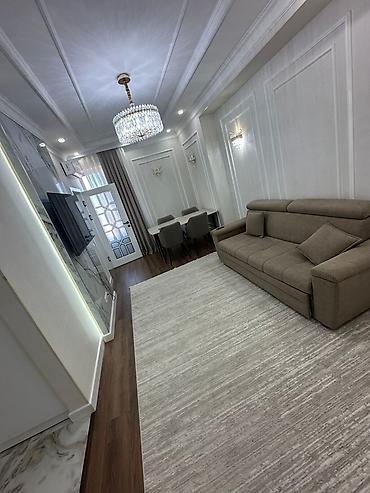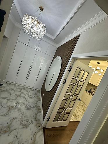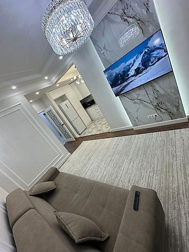 - Отделка и материалы: стены с декоративными молдингами, акцентная ТВ-зона с крупноформатным керамогранитом под мрамор и подсветкой, потолок с нишами и точечными светильниками, два хрустальных потолочных светильника. Напольное покрытие — износостойкий ламинат под натуральное дерево, в санузле — плитка под мрамор.