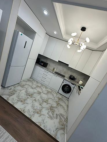- Кухня: гарнитур в светлых тонах с прямыми фасадами, высокие шкафы до потолка, варочная зона, духовой шкаф, вытяжка, холодильник.