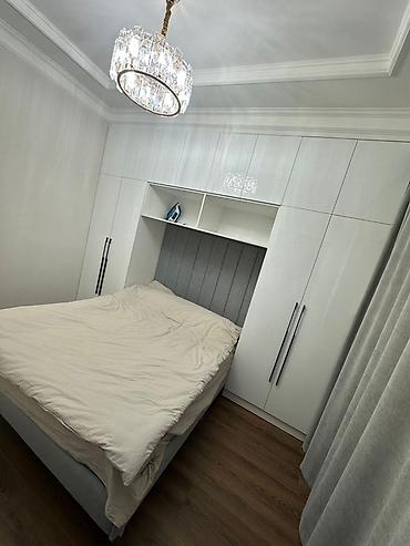- Спальня: двуспальная кровать с мягким изголовьем, встроенная система хранения во всю стену с нишей и длинными ручками; плотные шторы блэкаут.