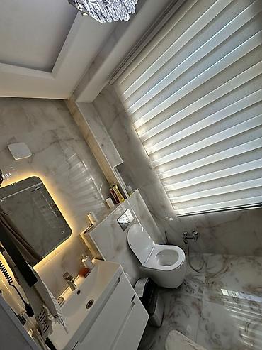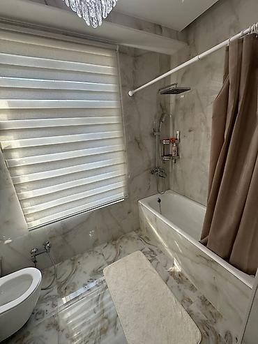 - Санузел: ванна с тропическим душем и ручной лейкой, гигиенический душ, рулонные шторы на окне, подвесной унитаз, пол и стены из полированного керамогранита, потолочный светильник.