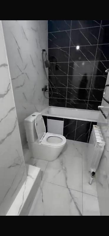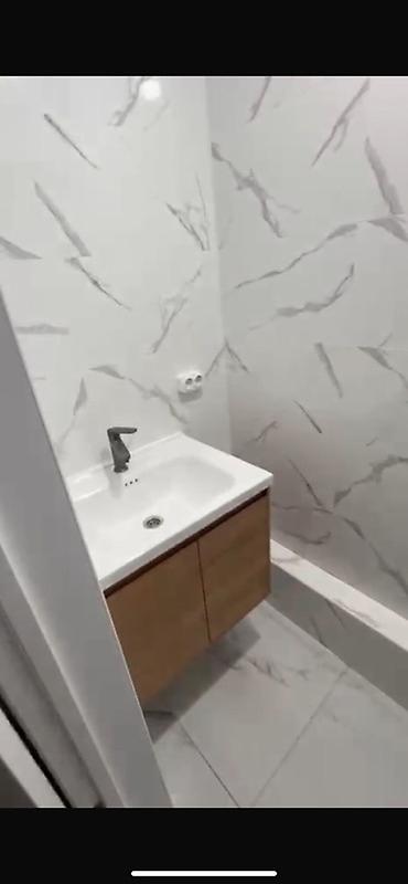 - Санузел: облицовка керамогранитом «под мрамор», тумба с умывальником и смесителем, напольная плитка.
