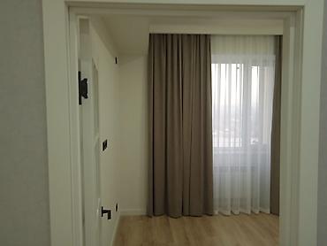 - Окна: панорамные проемы, двойной текстиль — плотные бежевые портьеры и белые полупрозрачные шторы, скрытый карниз.