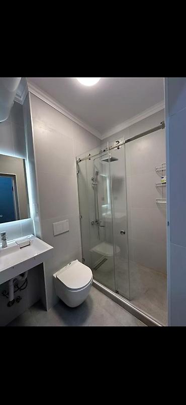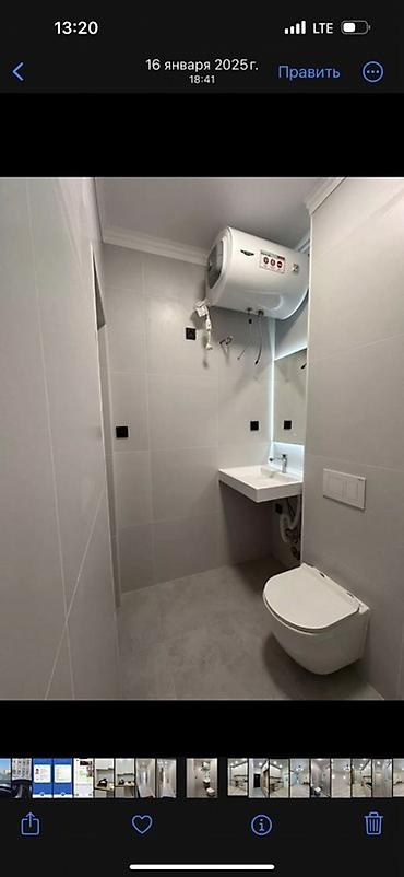 - Санузел: плитка в серо-белой гамме, подвесной унитаз с инсталляцией, умывальник с монолитной столешницей, большое зеркало с подсветкой, установлен электрический накопительный водонагреватель, выведены коммуникации под стиральную машину.