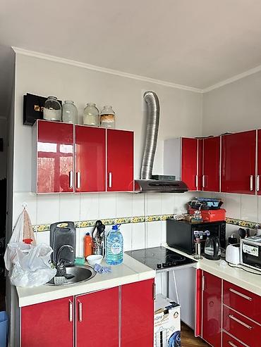 - Кухонная зона угловая с яркими красными фасадами, столешницей ПВХ, мойкой, вытяжкой с воздуховодом, варочной панелью, шкафами для хранения, местом под технику, холодильник.