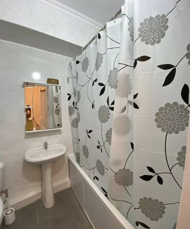 - Ванная комната с полноценной ванной, душевой шторкой, умывальником на пьедестале и зеркалом.