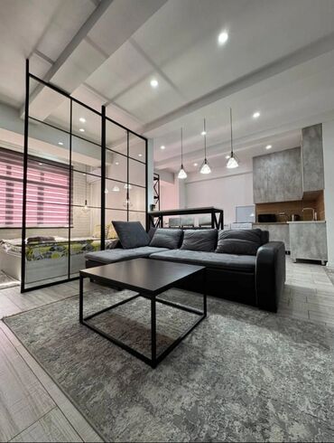 - Планировка: единое пространство с зонированием стеклянной перегородкой в черном металлокаркасе (спальня отделена от гостиной), кухня-гостиная с барной зоной.