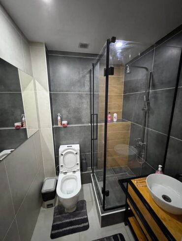 - Санузел: душевая кабина с черной фурнитурой, верхний и ручной душ, унитаз, тумба под раковину с деревянной столешницей, большое зеркало, вытяжка.