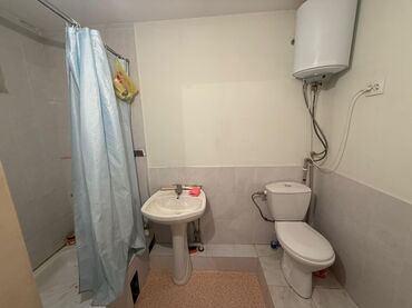 - Санузел совмещенный: душевая зона с шторкой, раковина, унитаз, электрический водонагреватель.