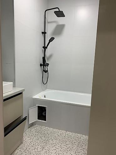 - Ванная комната с ванной и душевой стойкой «тропический душ», тумба с умывальником, скрытые ревизионные люки, светлая плитка.
