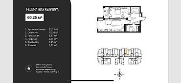Предлагается 2‑комнатная студия площадью 60 м² на 14 из 15 этажей.