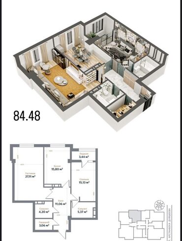 Площадью 84.48 кв.м. ( двухкомнатная) 6 этаж из 15 этажей.