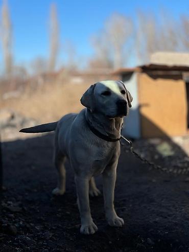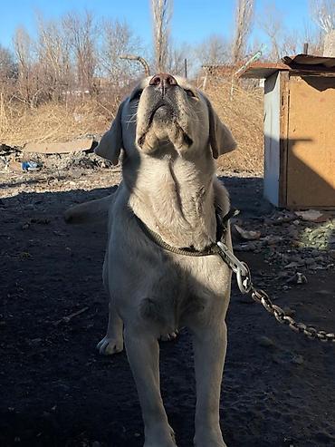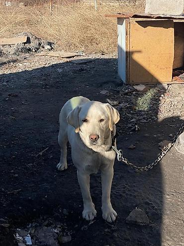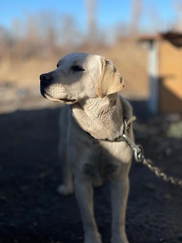 Лабрадор-ретривер, самка, светло-бежевый (палевый) окрас. Крупный, мощный корпус, широкая грудь, крепкие лапы. Шерсть короткая, плотная, с хорошим подшёрстком. Уши средние, висячие; хвост «выдровый». На фото — на прочной цепи с ошейником.