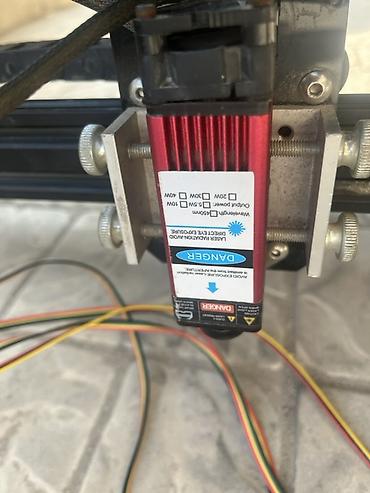 - Лазерный модуль диодного типа (красный корпус с радиатором и вентилятором). На шильдике указаны варианты питания до 40 Вт потребляемой мощности, выходная — до 5,5 Вт (типичный диодный луч). Фокусируемая оптика, крепление с регулировкой высоты.