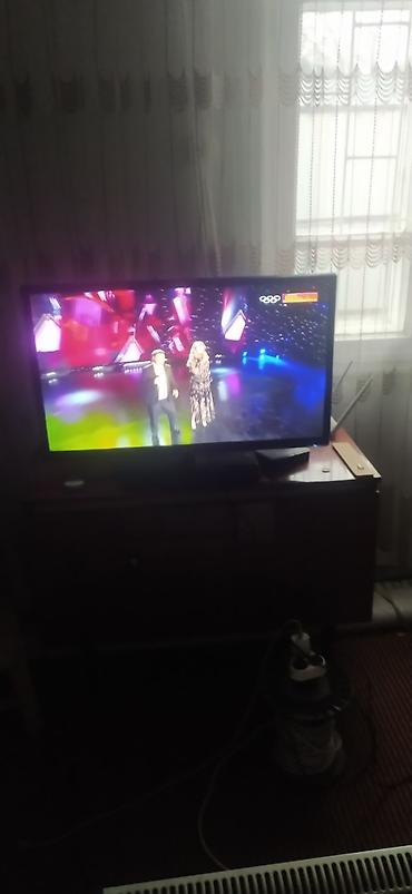 Телевизор LED, диагональ экрана около 32–40". Плоская панель, широкие углы обзора, яркая и насыщенная картинка, подходит для эфирного/кабельного ТВ. На корпусе индикатор питания. Узкие рамки, классическое черное исполнение. Управление с пульта ДУ (виден на фото). Установлен на тумбу, возможна установка на тумбу или крепление на стену через VESA (крепеж не показан). Подходит для гостиных и спален, комфортно смотреть фильмы, передачи и концерты.Ютуба нет.Акнет,через оборудование возможен.