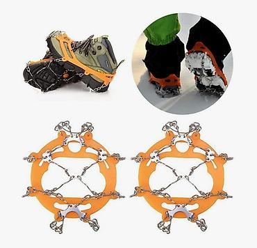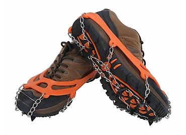 - Конструкция: эластичная рамка из морозостойкого силикона/термоэластомера оранжевого цвета, металлические цепи и шипованные пластины из нержавеющей стали. Цепи охватывают всю подошву, обеспечивая равномерное сцепление в носке, середине и пятке.