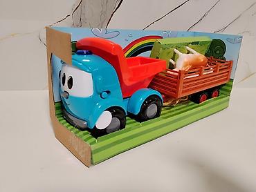 - Игровой набор: синий грузовичок Лёва с красным кузовом и прицепом-фургоном для перевозки животных (в комплекте фигурки коров/животных).