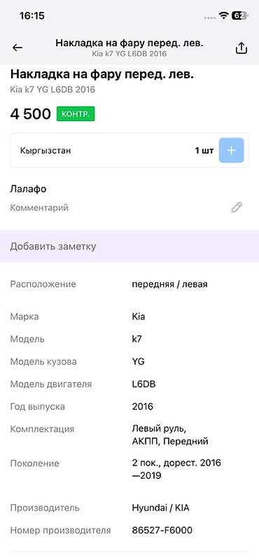 - Применяемость: Kia K7 (YG), 2‑е поколение, дорестайлинг 2016–2019, левый руль