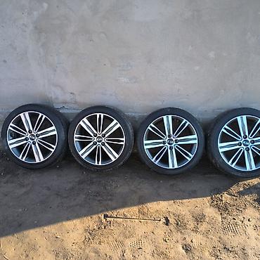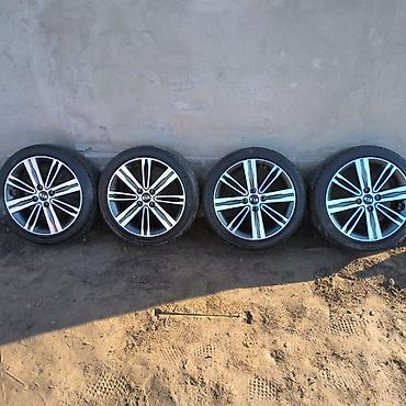 Комплект легкосплавных колесных дисков KIA с шинами. Диски имеют многоспицевый дизайн с чередованием серебристых и темных элементов, что придает им современный вид. В центре каждого диска находится логотип KIA. Эти колеса подходят для установки на соответствующие модели автомобилей KIA, обеспечивая улучшенный внешний вид и производительность.