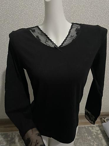- Черная с V‑вырезом и вставками из тонкого кружева: кружевная планка по горловине и на манжетах, маленький декоративный бантик спереди.