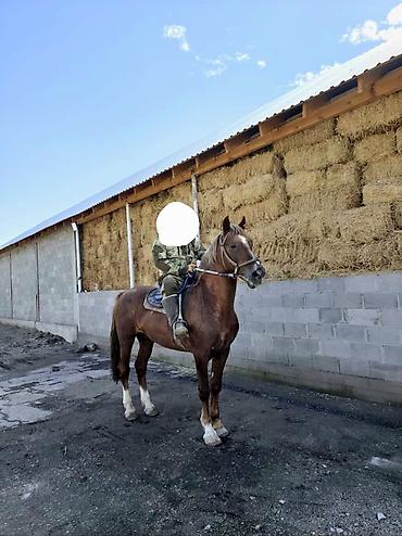 Лошадь верховая, гнедой масти с белыми отметинами на ногах и лбу. Крепкий костяк, широкая грудь, мощная шея, ровные сухие конечности. Удобные ходы, уверенно держит рысь и галоп, спокойно идет в поводу и под седлом. На фото — упряжь: уздечка с трензелем, классическое универсальное седло с вальтраком. Подходит для прогулок, любительской выездки и хозяйственных работ на подворье. Не пуглива, адекватна в хозяйстве и на улице, хорошо переносит разные погодные условия. Отличный вариант для частного подворья или конного туризма.