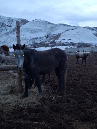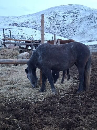 Лошадь, темно-серая (графит), густая зимняя шерсть. Компактный рост, крепкий корпус, ровные конечности, объемный хвост и грива. Спокойный характер, стоит у кормушки без беспокойства, хорошо переносит холод и уличное содержание в загоне. Подходит для хозяйства и прогулок по пересеченной местности. Питается сеном, неприхотлива в кормлении. На фото — фактическое животное на подворье, доступна для осмотра в загоне.