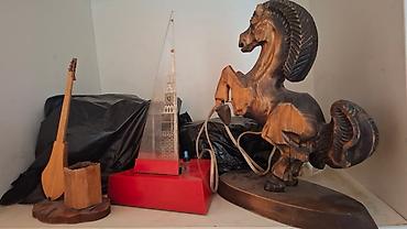 - Деревянная резная фигура коня на подставке — декоративная скульптура ручной работы.