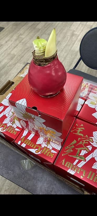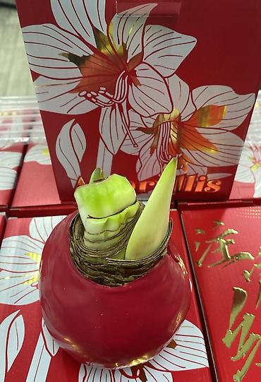 - Луковица амариллиса покрыта декоративным цветным воском, не требует горшка и почвы.