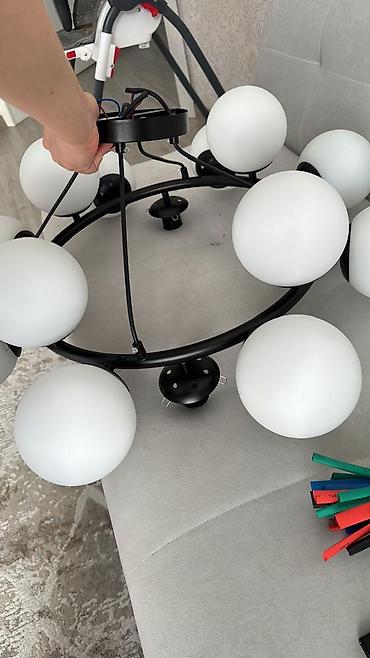 В комплекте: каркас люстры, плафоны-сферы, потолочная чашка для крепления, проводка для подключения (как на фото).