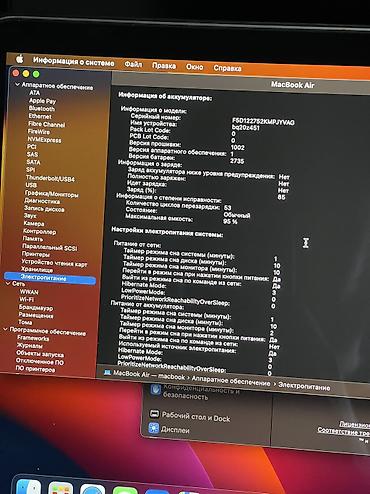 - Аккумулятор: 53 цикла перезарядки, максимальная ёмкость 95% (состояние «Нормально» по информации системы)
