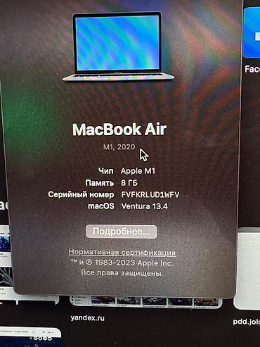 Apple MacBook Air A2337 (M1) 13" Ключевые характеристики: - Чип Apple M1 (8‑ядерный CPU) - Оперативная память 8 ГБ - Накопитель SSD 256 ГБ - Дисплей 13.3" Retina (2560×1600), True Tone, широкая цв...