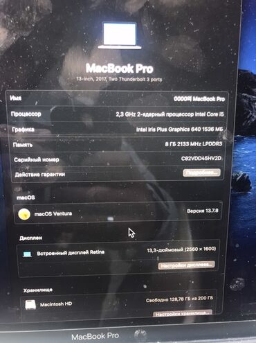 Ноутбук, Apple, 8 ГБ ОЗУ, Intel Core i5, 13.3 ", Б/у, Для работы, учебы, память SSD