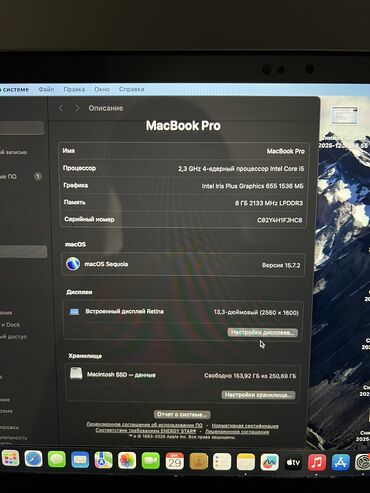 - Дисплей: встроенный Retina , разрешение 2560×?ерационная система: macOS Sequoia, версия 15.7.2