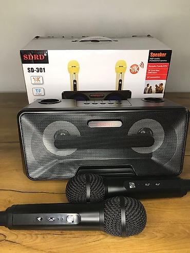 В комплект входят стерео колонка (база) SD-301, два беспроводных микрофона, зарядный провод MicroUSB, аудио кабель AUX 3.5 мм/microUSB, руководство пользователя на английском и китайском языках, а также упаковка/коробка для хранения и переноски.