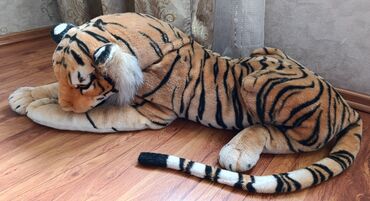 Мягкая игрушка в виде лежащего тигра. Игрушка выполнена из мягкого плюшевого материала с характерным оранжевым окрасом и черными полосами, имитирующими расцветку тигра. Хвост длинный, с черно-белыми полосами и пушистым кончиком. Игрушка подходит для детских игр и может служить элементом декора в детской комнате или другом помещении.