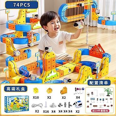 В каждом наборе: прямые и кривые секции, спиральные/волнистые элементы, магнитные коннекторы, опоры и площадки, элементы моста, дорожные знаки (комплект из 19 штук), поезд(а) и зарядный/соединительный кабель (по спецификации набора, см. изображения с раскладкой). Конфигурация и точное количество позиций зависят от выбранного комплекта — указано на схеме в карточке товара.