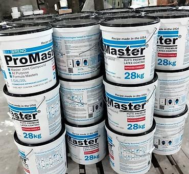 - Готовая шпатлёвка ProMaster (ведра 28 кг) – латексная, универсальная (All Purpose). Для стартовых и финишных работ по гипсокартону, бетону, штукатурке; легко наносится и шлифуется, образует прочное гладкое покрытие.