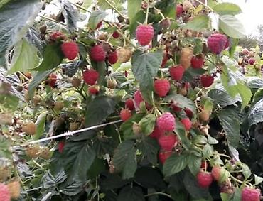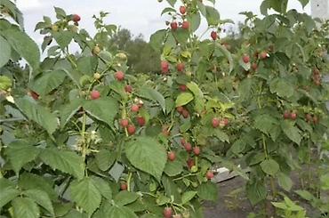 Саженцы малины (плодоносящие ряды) - Культура: малина садовая, крупноплодные кусты.полька поляна моравила аралаш - Стадия: плодоношение в текущем сезоне; на побегах завязи и спелые ягоды. - Посадк...