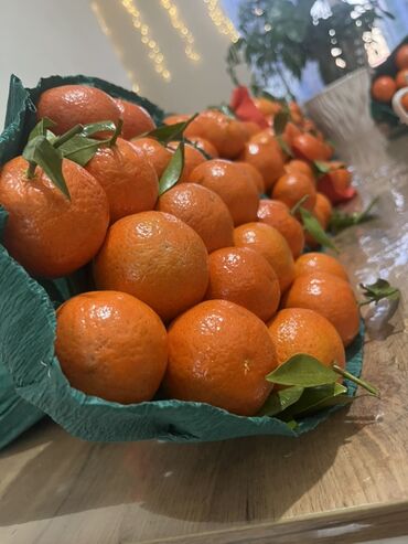 - Состав: свежие мандарины с веточками и листочками, оформленные в декоративную креп-бумагу (зелёную и красную).