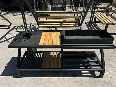 Мангал-стол для шашлыка и гриля - Конструкция: стальной мангал на прочной металлической раме с двумя широкими боковыми столешницами и нижней полкой из обожжённой древесины. Удобная рабочая высота,...