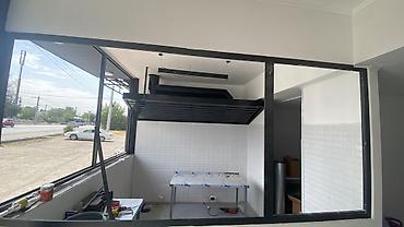 - Два мощных вытяжных зонта с дымоходами над рабочими зонами и отдельный зонт в помещении: стальной каркас, жироуловители, подключение к воздуховоду, возможность потолочного крепления.