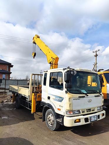 Грузовик Hyundai с бортовой платформой и манипулятором - Марка/тип: Hyundai, бортовой малотоннажный грузовик с краном-манипулятором (стрела жёлтого цвета, крюк, таль). - Колёсная формула: 2 оси, з...