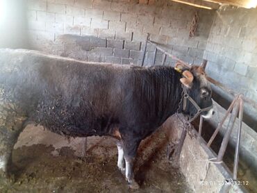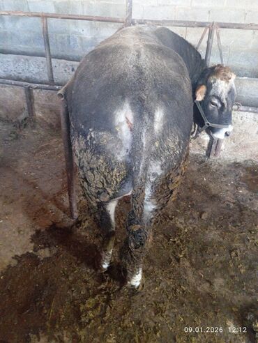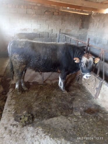 Бык-производитель, чёрно-пёстрый окрас. Крупный, сильный, с широкой грудью и хорошо развитыми мышцами. Содержится в крытом загоне, на привязи, с кормушкой для сена. На фото — реальное животное, спо...