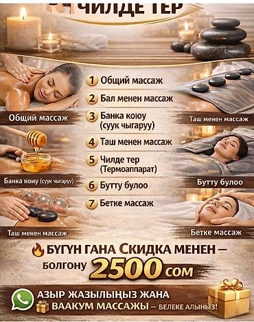 Массаж классический (жакшылап окуп анан чалыныз) работаю в основном с застоями Бишкек Джал виды: классический медовый массаж(лицо,живот) б...