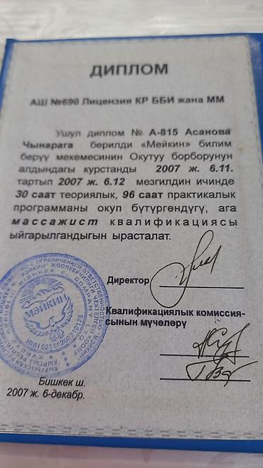 - Диплом массажиста (теория 30 часов, практика 96 часов), выдан в Бишкеке в 2007 г., подтвержден печатью и подписями