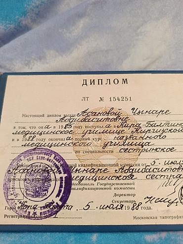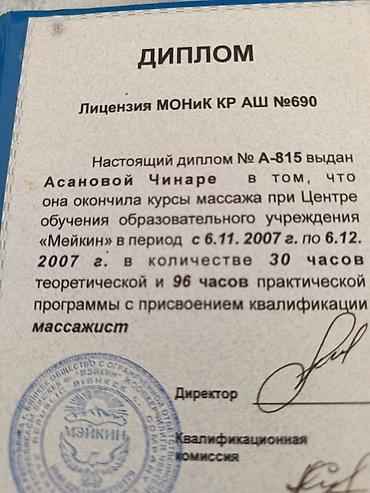 - Массажист: Чинара Асанова. Официальный диплом с присвоением квалификации «массажист» (курсы Центра обучения «Мейкин», 30 часов теории и 96 часов практики). Документы и печати на фото.