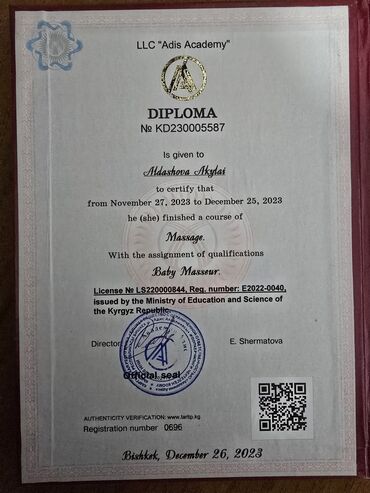 Здравствуйте, меня зовут Мээрим. Я специалист по детскому массажу. Делаю все виды массажа (общеукрепляющий, профилактический, гипертонус, гипотонус, дисплазия, дцп, кривошея, плоскостопие, вальгус,...