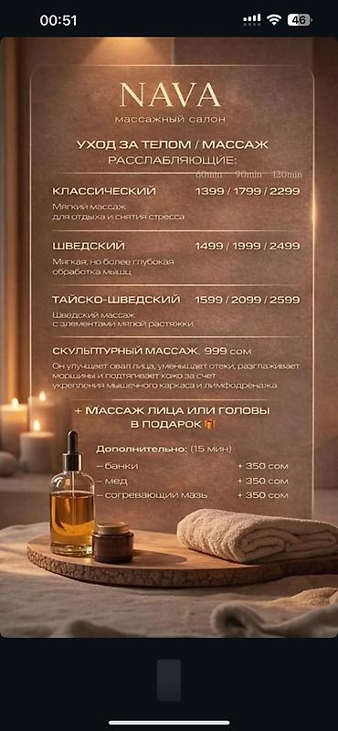 Массаж Massage в Бишкеке Косметолог ✅ Уз чистка лица 1500 ✅Классический массаж : -45 минут 1500с - С двух сторон 2000/60 мин - 90 мин 3000 Лечебный массаж общий: - 60 мин/2200 - 90 ...