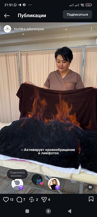 - Термотерапия «огненное укутывание» (огненный массаж-обёртывание): интенсивное прогревание, которое активирует кровообращение и лимфоток, способствует глубокому расслаблению и детокс-эффекту.
